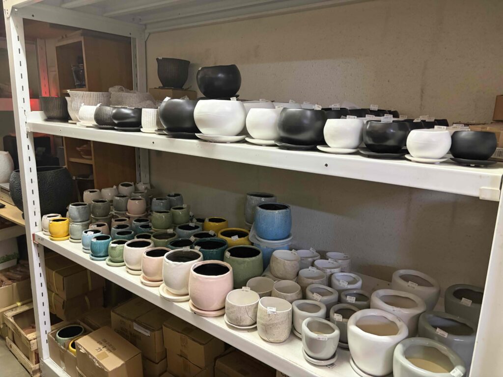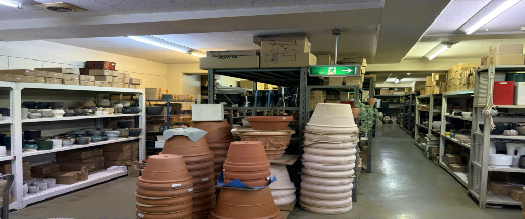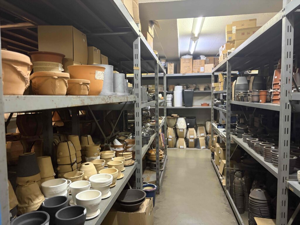 オーミトーキの倉庫には、大小さまざまな植木鉢や陶器を常時2,700点以上ご用意しています。